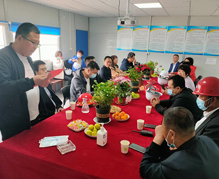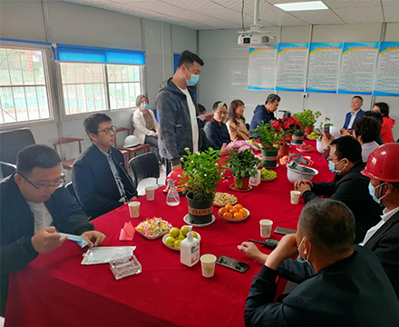 在會議室召開慶祝封頂會議,項目經(jīng)理侯紅磊匯報項目施工情況,總監(jiān)理工程師講話。
